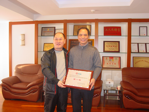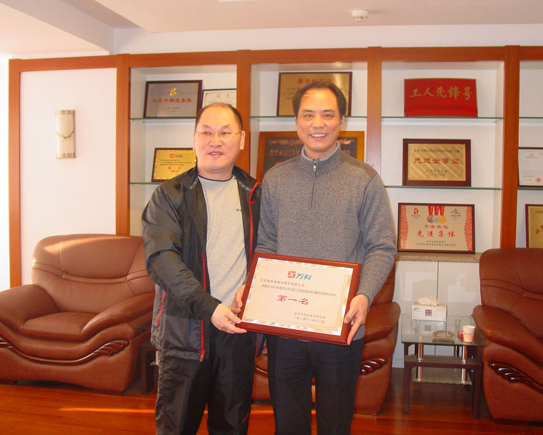北京萬科領導親赴北京公司授牌 時間:2010-12-14 5251 北京公司在萬科地產第三季度萬科北京區域在建項目產品質量評估中,萬科藍山項目經專家現場實測實量,390個點合格率為99.39%,觀感質量評分、質量風險評估綜合得分97.35%,項目綜合排名蟬聯第一。12月12日上午,北京萬科副總經理孔祥明率工程部經理、項目總經理等一行,特地趕到我公司,把第一名的獎牌隆重授予我公司陳榮春總經理。陳總對萬科的肯定和信任表示感謝,并期望雙方進一步加強友好合作,永續真誠友誼。