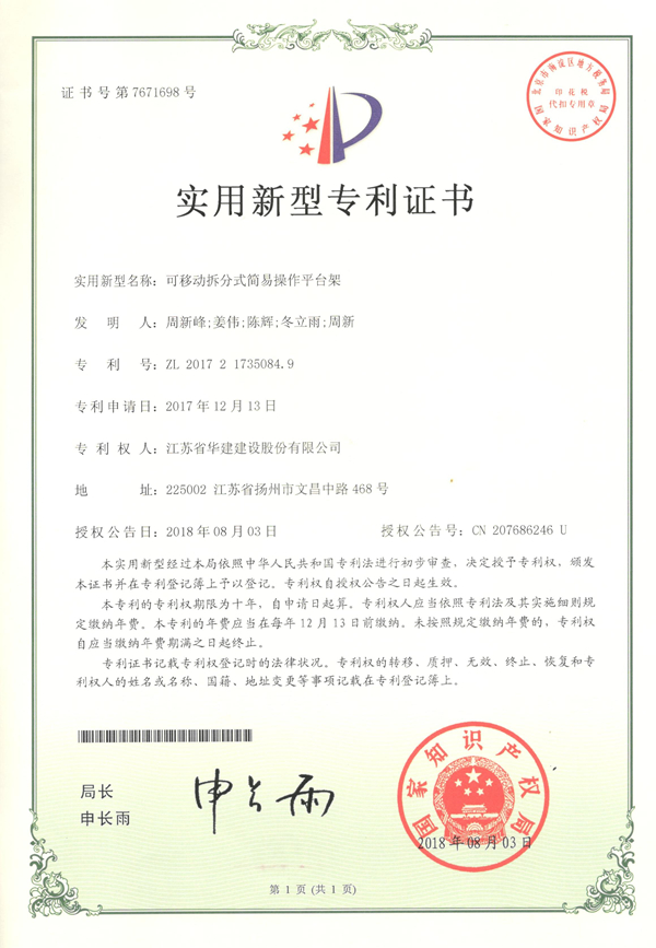 北京公司獲一項實用新型專利 時間:2018-09-07 3143 近日,從國家知識產權局傳來喜訊,北京公司發布的《可移動拆分式簡易操作平臺架》(專利號:ZL201721735084.9)獲得實用新型專利。
