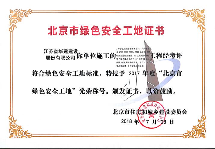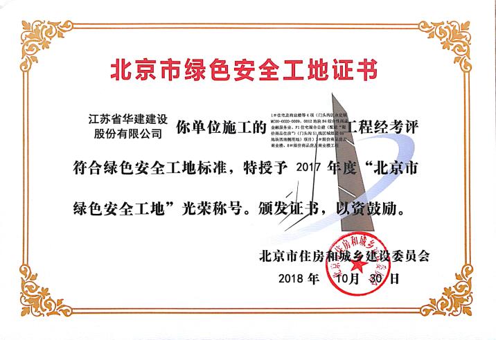 北京公司兩項工程獲北京市綠色安全工地 時間:2018-11-11 3621 近日,從北京市住房和城鄉建設委員會傳來喜訊,由北京公司總包承建的1#住宅及商業樓等4項(1#住宅及商業樓、2#住宅及商業樓)和1#住宅及商業樓等4項(3#限價商品房及商業樓、8#限價商品房及商業樓)兩個標段項目榮獲 “北京市綠色安全工地”光榮稱號,并獲頒證書。