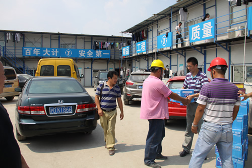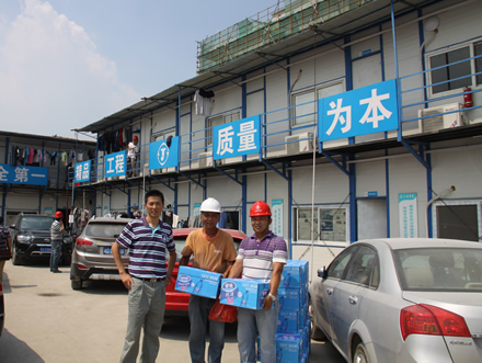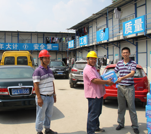 為一線員工送清涼 時間:2013-07-29 4892 驕陽似火,熱浪滾滾,持續(xù)近一個月的高溫天氣給工程正常施工帶來了很大的影響,奮戰(zhàn)在烈日炎炎下的一線員工的身體狀況時刻牽動著公司領導的心。7月29日,上海室外溫度更是超過40度,江蘇華建副總經理、上海分公司總經理楊杰特地委托總工程師魏春明、工會副主席陳德權等同志赴由公司承建的上海楓葉國際學校工地看望一線作業(yè)人員,為員工送去了礦泉水、毛巾等清涼慰問品,并叮囑要注意避開高溫作業(yè)時段,保護身體,確保夏季施工生產安全。