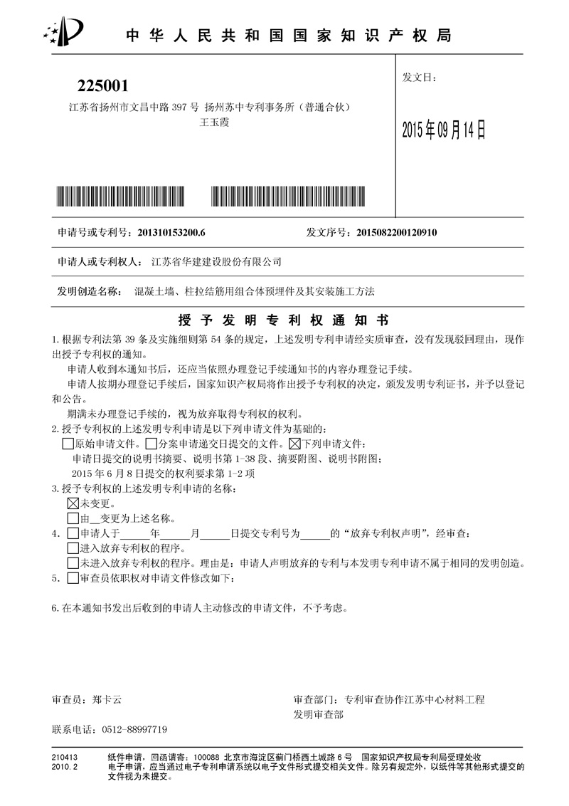 公司獲一項發明專利 時間:2015-09-15 5648 日前,江蘇華建上海區域公司發布的《混凝土墻、柱拉結筋用組合體預埋件及其安裝施工方法》發明創造被國家知識產權局授予“發明專利權”,專利號:201310153200.6。