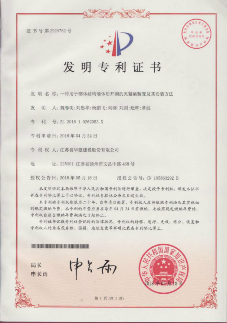 江蘇華建再獲1項發明專利、3項實用新型專利 時間:2018-06-06 3081 日前,從國家知識產權局傳來喜訊,江蘇華建上海區域公司發布的《一種用于砌體結構墻體后開洞的夾緊梁裝置及其施工方法》獲得發明專利授權(專利號:ZL201610262053.X),《一種建筑板材角磨機》(專利號:ZL201720592798.2 )、《一種建筑施工用鋼筋切斷機》(專利號:ZL201720593659.1 )、《一種建筑施工用混凝土攪拌機》(專利號:ZL201720593516.0 )獲得實用新型專利授權。