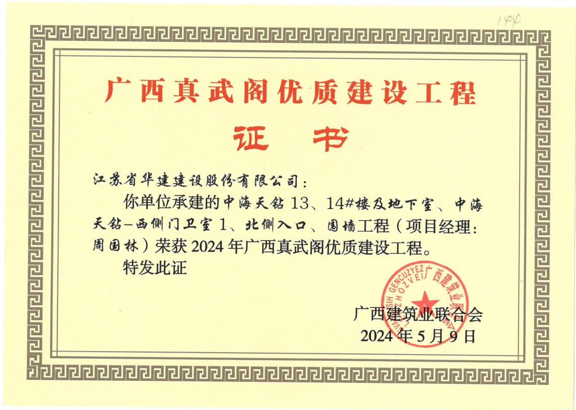 近日傳來喜訊,江蘇華建北京分公司三項工程榮獲質(zhì)量獎。中海天鉆13、14#樓及地下室、北側(cè)入口、圍墻工程和中海天鉆11、12#樓及地下室分別獲2024年廣西建設(shè)工程“真武閣杯”獎;中海望京府1#樓工程獲包頭市“金鹿杯”獎。