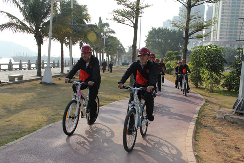 2012年元旦,珠海公司開展騎自行車迎新年活動。機關(guān)全體員工統(tǒng)一著裝,頭戴印有江蘇華建標(biāo)識的安全頭盔,騎著統(tǒng)一插有江蘇華建小紅旗的自行車,從珠海海濱浴場出發(fā),沿著海濱綠道,一直騎往終點淇澳島,來回全程56公里。無論是年近6旬的老員工,還是剛工作不久的新員工,個個爭先恐后,奮勇向前。繆國樞總經(jīng)理身先士卒,騎行在隊伍的最前面。這支特殊的“騎兵隊”在新年的第一天飛馳在珠海的海濱綠道上,引導(dǎo)車上醒目的江蘇華建大旗迎風(fēng)招展,每輛車前面的小紅旗也分外引人注目,形成了一道亮麗的風(fēng)景線,引得許多路人和游客紛紛駐足觀望,有的攝影愛好者用鏡頭記錄下這美麗的一刻。