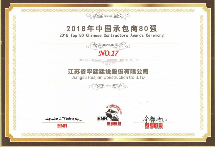 118日,由美國《工程新聞記錄》(簡稱ENR)和中國《建筑時報》主辦的2018中國承包商80強和工程設計企業60排名正式揭曉,江蘇華建再次入選中國承包商80強榜單,列第17位。