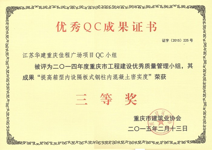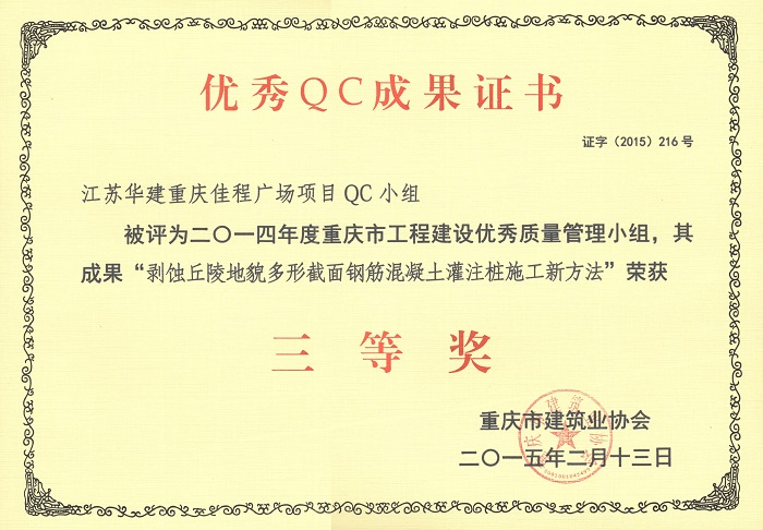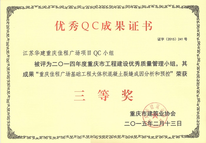 近日,重慶市建筑業(yè)協(xié)會(huì)發(fā)文表彰了一批優(yōu)秀QC成果,公司重慶佳程廣場(chǎng)項(xiàng)目QC小組被評(píng)為2014年度重慶市工程建設(shè)優(yōu)秀質(zhì)量管理小組,其成果“提高箱型內(nèi)設(shè)隔板式鋼柱內(nèi)混凝土密實(shí)度”、“剝蝕丘陵地貌多形截面鋼筋混凝土灌注樁施工新方法”、“重慶佳程廣場(chǎng)基礎(chǔ)工程大體積混凝土裂縫成因分析和預(yù)控”等均榮獲三等獎(jiǎng)。