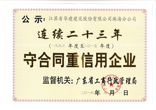 連續(xù)二十三年獲得“守合同重信用企業(yè)”的榮譽稱號,是政府主管部門和行業(yè)的認(rèn)可和鼓勵,這份榮譽將鞭策珠海公司將誠實守信、合法經(jīng)營的企業(yè)理念一如既往地灌輸?shù)矫恳粋€工程建設(shè)中去,持續(xù)做好企業(yè)誠信體系建設(shè),保持自身競爭優(yōu)勢,樹立守法履約的良好施工企業(yè)形象。