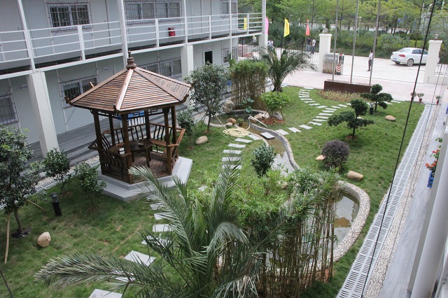 第五項目部負責人陳建表示,在該項目進場之初,就秉承“綠色、環(huán)保、節(jié)能”的理念,項目部園林景觀的打造全部采用可回收、循環(huán)利用的材料。花盆采用廢模板制成,水池循環(huán)供水,生活區(qū)照明全部采用節(jié)能燈,淋浴設施采用空氣能熱水器,空調(diào)采用節(jié)能產(chǎn)品;并將具有揚州特色的園林景觀融入其中,進行精心布局、合理規(guī)劃,將其打造成為工地上的微縮版揚州園林,不僅展示出揚州建筑企業(yè)對外的良好形象,更為員工營造一個溫馨舒適的綠色家園。