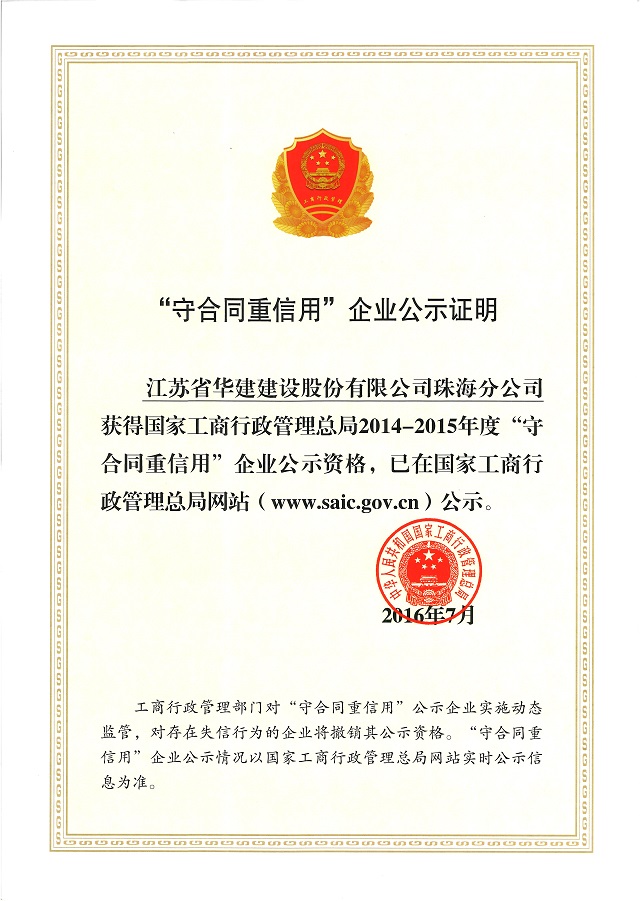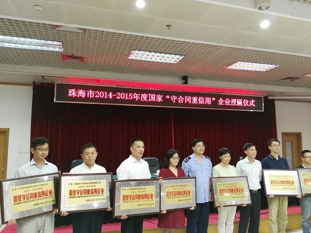 珠海市工商局舉行國家“守合同重信用”企業授匾儀式 時間:2016-10-29 2791 2016年10月28日下午,珠海市工商行政管理局舉行2014—2015年度國家“守合同重信用”企業授匾儀式,珠海市副市長賀業民出席儀式,為獲評企業頒發國家“守合同重信用”企業牌匾、證書,并發表講話,向獲評的13家企業表示祝賀,希望大家繼續努力,像愛護眼睛一樣愛護企業誠信,為建設誠信珠海、誠信社會做出更多貢獻。 江蘇省華建建設股份有限公司珠海分公司已連續二十三年獲評廣東省“守合同重信用”企業稱號,并于2004年、2016年兩次獲評國家級“守合同重信用”企業稱號。