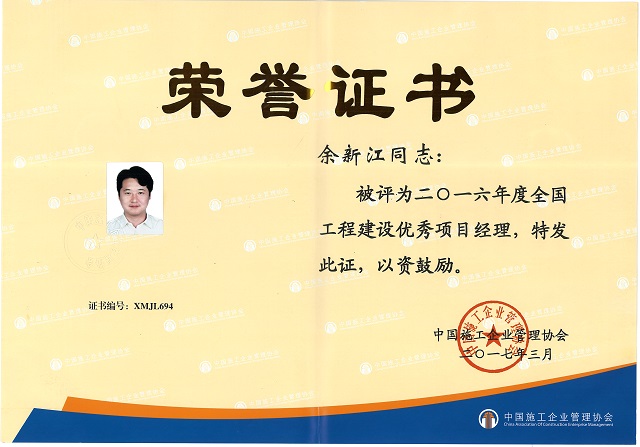 余新江榮獲“2016年度全國工程建設優秀項目經理” 時間:2017-04-24 3339 4月20日 ,中國施工企業管理協會第32次年會在廈門召開。會上,中施企協對全國優秀項目經理進行了表彰,珠海分公司余新江同志被授予“2016年度全國工程建設優秀項目經理”稱號。