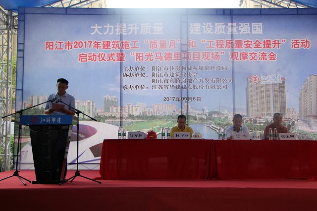 珠海區域公司總經理呂方達出席會議并發言。呂總在發言中指出,江蘇華建自進入陽江市場以來一直秉承“質量興企”的基本理念,高度重視質量管理工作,在陽江市場樹立了良好的口碑。陽光馬德里二期56-61棟項目在決策前期就先確立高起點的質量創優目標,在施工過程中嚴格執行各項流程、制度,通過宣傳、培訓、確立獎罰目標等方式在項目部內部創造了良好的創優氛圍。同時加大對新型綠色施工技術、新材料、新工法的創新投入,主體結構采用鋁模技術施工,創造了3天一層的陽江建設新速度。呂總表示,本次活動放在我們施工現場舉行,既是對江蘇華建的信任,更是一種鞭策!今后將一如既往地繼續重視質量管理工作,多創精品工程,不辜負陽江市住建局和廣大業主的信任、支持,力爭在質量創優、技術創新方面取得更多、更好的成績!