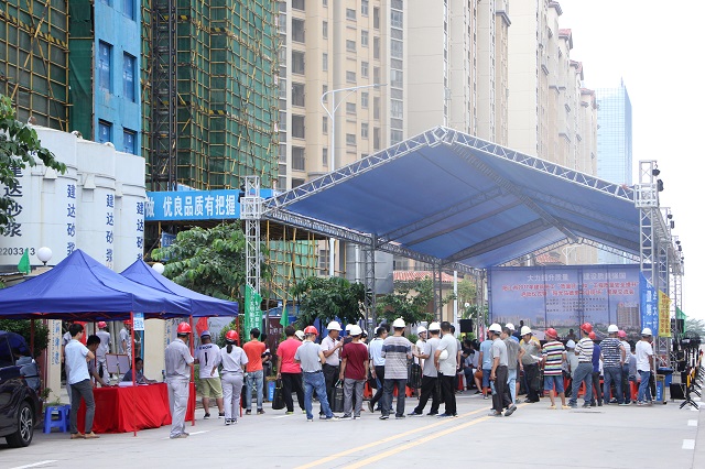 繼“2017年陽江市建筑工程安全生產文明施工示范工地現場觀摩會”之后,9月6日,陽江市“2017年建筑施工質量月和工程質量安全提升活動啟動儀式暨現場觀摩交流會”再次在我公司總包承建的陽光馬德里項目現場隆重舉行。陽江市住房規劃建設局分管質量安全副局長張牛、市質安監站站長林子歡、市建筑協會會長梁榮照,市建管科、質安監站全體人員,各縣(市、區)住房規劃建設局分管質量安全副局長、建管股股長、質監站站長,市直各施工企業和監理企業分管工程質量領導、質安部門負責人,市區在建工程建設單位代表,施工單位項目經理、質量員,監理單位項目總監和專業監理工程師,各縣(市、區)在建重點項目建設單位代表、施工單位項目經理、監理單位項目總監等400余人參加大會并觀摩陽光馬德里二期56-61棟施工現場。