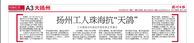 8月23日,珠海遭遇了53年來最強臺風“天鴿”,全市受災嚴重。臺風過后,珠海公司第一時間迅速組織復產自救工作,并主動聯系珠海有關部門,迅速組織志愿者及重型工程車輛投入到社會道路的清理中去。在這場抗風救災的戰斗中,珠海公司共疏通社區道路5條、市政道路3 條,清走倒伏大樹200余棵,運送災后垃圾 20車次。《揚州日報》A3版顯著位置對公司抗風救災活動進行了報道,點評江蘇華建珠海公司“眾志成城,生產自救,展現了揚州建筑大軍的良好形象”。