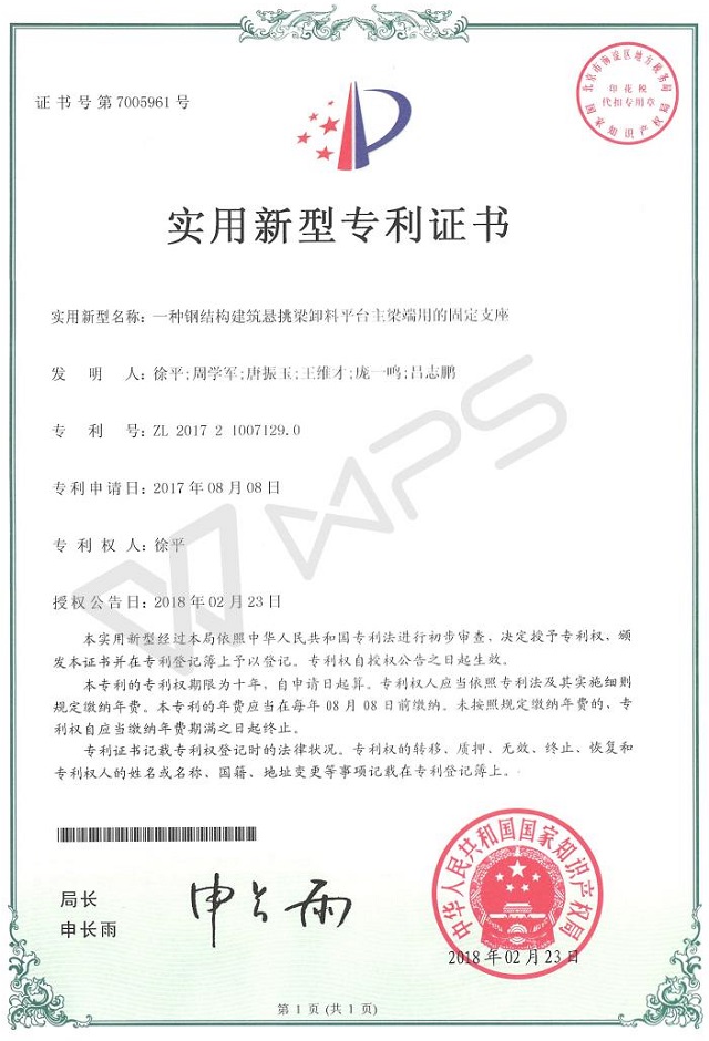 公司新獲一項國家實用新型專利授權 時間:2018-03-09 2841 近日,從國家知識產權局傳來喜訊,公司申請的《一種鋼結構建筑懸挑梁卸料平臺主梁端用的固定支座》獲得實用新新型專利授權。 該專利取材于公司標桿項目華策國際大廈,在建筑鋼結構懸挑梁卸料平臺主梁端固定支座的安裝施工中,技術人員創造性地設計了一種結構簡單、便于拆裝且無需對建筑進行安裝預處理的固定支座。該支座能夠配合現有的較為先進的建筑方式,大幅提高施工效率,并降低安裝、拆卸過程中的安全風險。