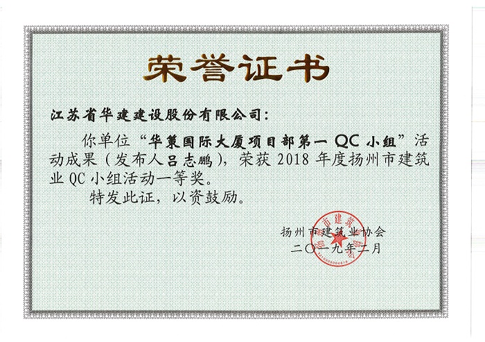 近期,揚州市建筑行業(yè)協(xié)會公布了2018年度揚州市工程建筑業(yè)優(yōu)秀QC小組活動成果評比結果,公司共有9項成果受到表彰。其中,華策國際大廈項目部QC小組“設備機房減振降噪的創(chuàng)新方法”成果榮獲一等獎;華策國際大廈項目部QC小組“提高鋼結構工程高強螺栓安裝合格率”、威麗詩花園一期QC小組“降低地下室主體結構滲水率”和再生時代項目部QC小組“提高超高層空間鋼柱安裝精度”三篇成果榮獲二等獎;華策國際大廈項目部QC小組“提高輕質(zhì)隔墻板施工質(zhì)量”及“提高超高層外包薄壁鋼板混凝土組合剪力墻安裝精度”、再生時代項目部QC小組“提高綠色施工驗收管理評價工作質(zhì)量”三篇成果榮獲三等獎;威麗詩花園二期QC小組“提高混凝土外觀質(zhì)量”和陽光馬德里QC小組“鋁合金模板混凝土表面氣泡控制”兩篇成果榮獲優(yōu)秀獎。