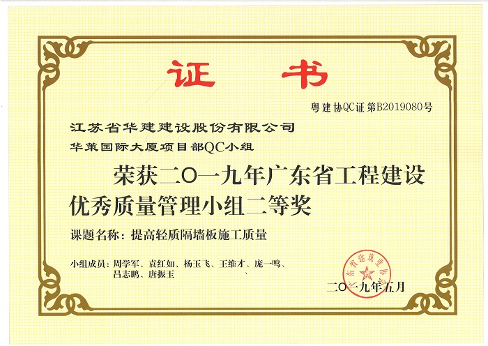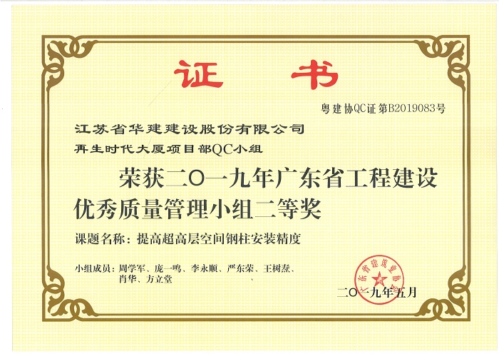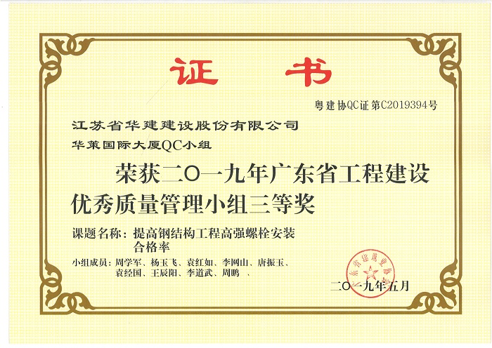 公司新添4項省級工程建設優秀QC成果 時間:2019-07-11 3777 近期,廣東省建筑業協會發文公布了2019年度廣東省工程建設優秀質量管理小組名單,公司華策國際大廈項目部QC小組“提高輕質隔墻板施工質量”、再生時代項目部QC小組“提高超高層空間鋼柱安裝精度”兩項成果喜獲二等獎,華策國際大廈項目部QC小組“提高鋼結構工程高強螺栓安裝合格率”榮獲三等獎。 華策國際大廈項目部QC小組“設備機房減振降噪的創新方法”成果在江蘇省建筑業協會組織的2019年度江蘇省工程建設質量管理小組活動中榮獲二等獎。