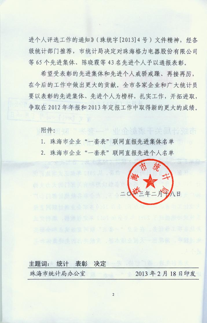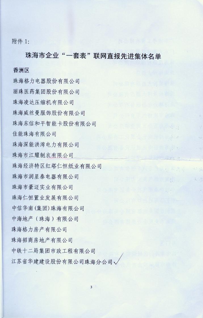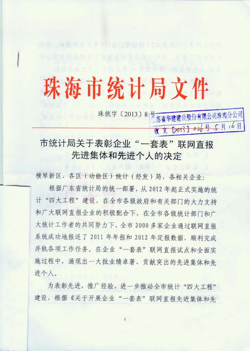 2013年珠海市統(tǒng)計(jì)局一套表聯(lián)網(wǎng)直報工作先進(jìn)單位
