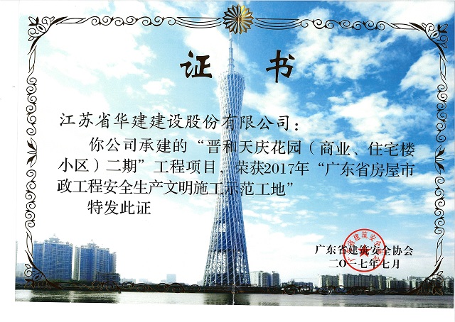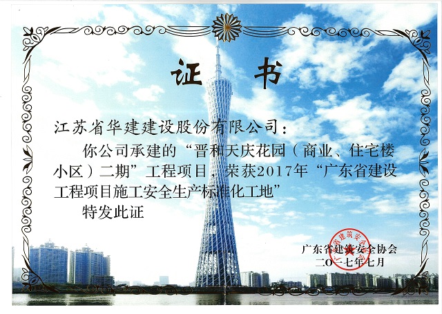 晉和天慶二期獲2017年廣東省建設工程項目施工安全生產標準化工地