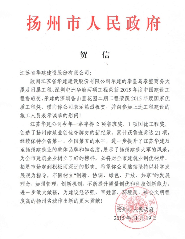 近日,揚州市政府專程向江蘇華建發來賀信,祝賀公司一年內獲得2項魯班獎,1項國優獎。公司今年...