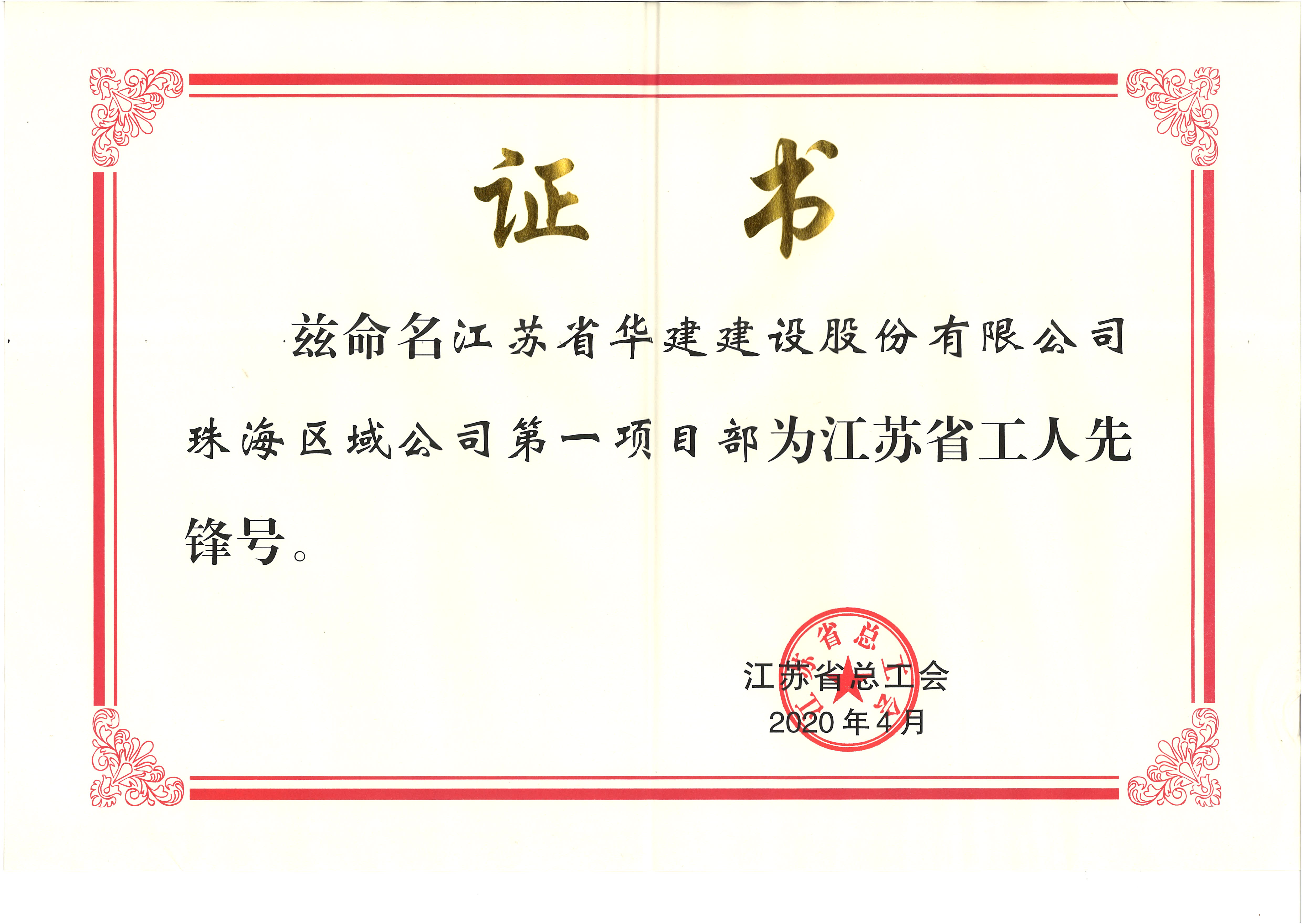 珠海區(qū)域公司第一項目部獲江蘇省工人先鋒號