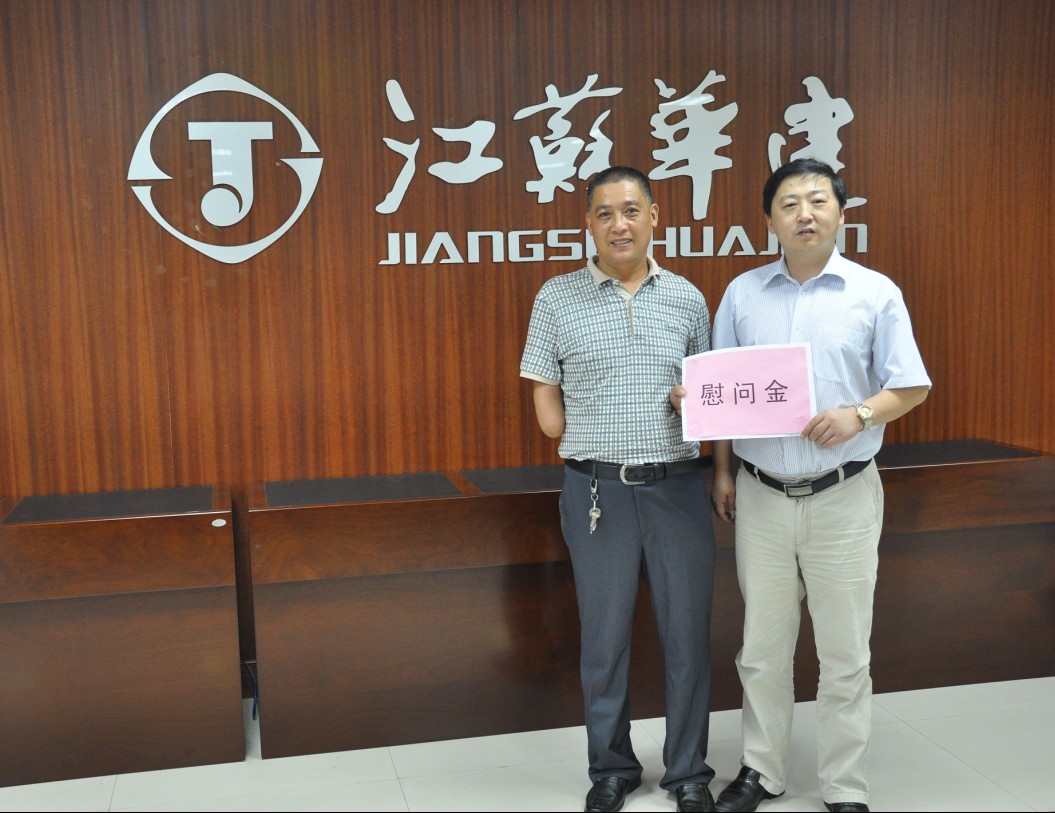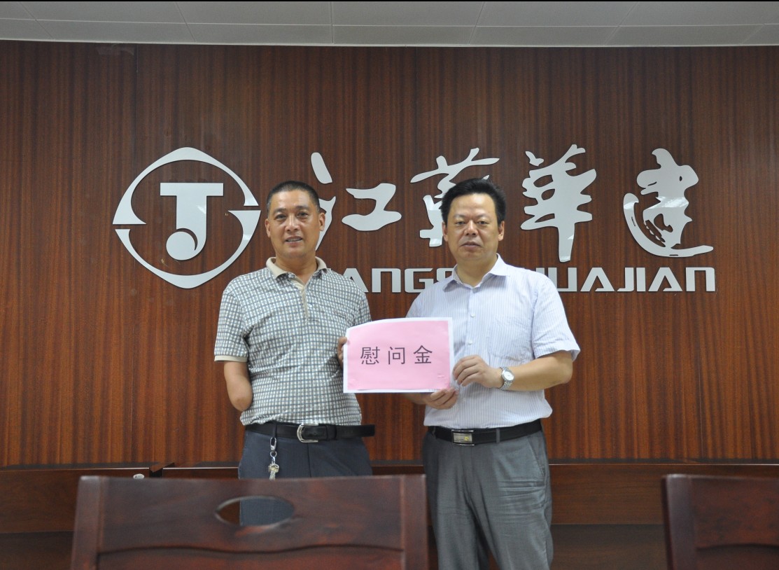 惠州區域公司慰問傷殘員工 時間:2013-08-06 3778 夏日炎炎,酷暑難耐。江蘇華建副總經理、惠州分公司總經理華恒榮率分公司工會親切慰問了在惠州分公司第九工程處工作的傷殘員工居家應(居家應90年代在寶應工作期間,不慎失去了右膀,被定為三級傷殘)。慰問中,華總詳細了解他的生活、工作情況,并向他發放慰問金,同時要求九處在工作、生活上給予一定的關心。居家應感謝組織對他的關心,表示身殘志不殘,更加積極努力的工作,不辜負組織的期望。惠州分公司總會計師高正金,分公司工會主席王健陪同慰問。