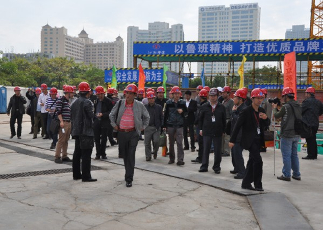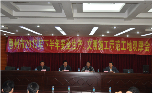 2013年11月27日上午,“廣東省房屋市政工程安全生產(chǎn)文明施工示范工地”示評會在惠州公司大隆·財富廣場項目工地現(xiàn)場召開。廣東省住房和城鄉(xiāng)建設(shè)廳質(zhì)量安全監(jiān)管處調(diào)研員彭雞寶、廣東省建筑安全協(xié)會會長鐘偉文、惠州市住房和城鄉(xiāng)規(guī)劃建設(shè)局副局長陳訓政、惠城區(qū)城鄉(xiāng)規(guī)劃建設(shè)局副局長月明應(yīng)邀出席了本次會議,一同參加會議的還有擔任本次評審工作的30位評審專家。會議由廣東省建筑安全協(xié)會副秘書長王啟主持。
