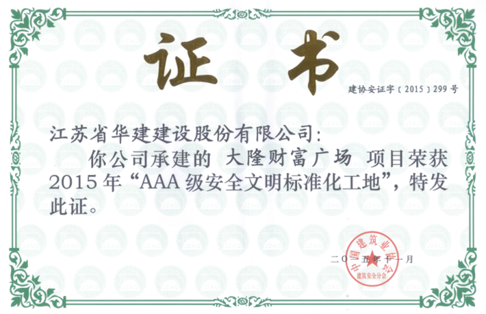 116,惠州分公司總工程師龐文榮參加了在西安召開的中國建筑業協會建筑安全分會2015年年會暨理事會,會上表彰了2015年 “AAA級安全文明標準化工地”獲獎單位。惠州分公司總承包施工的大隆財富廣場成為今年惠州市唯一獲此榮譽的項目,這是惠州分公司首次獲得國家級榮譽獎項。