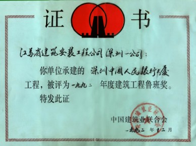 該工程位于深圳深南大道蔡屋圍地段,地上12層,地下室1層、高度48.6米,建筑面積21715平方米,于1987年1月破土動工,1989年8月竣工交付。工程由大型金庫、營業大廳、外匯交易所、電腦主機房、辦公室和多功能會議廳等組成,大廈前庭鋪設30級花崗石臺階,兩邊各設有50平方米的瀑布、噴泉,門庭內外各4根8.6米高的巨型金屬圓柱,采用不銹鋼鏡面裝飾,墻面大理石天然絲紋拼接,大廳配有4部電梯。除照明外,還配有電視、電話、廣播音響、消防自動報警、自動噴灑滅火、1211氣體消防等先進裝置。工程先后榮獲1991年度深圳市優質樣板工程、江蘇省優質工程(金獎)、江蘇省名牌工程和1992年度中國建筑工程“魯班獎”。