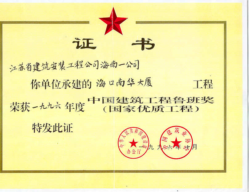 海口市南華大廈工程于1994年5月竣工,1995年6月被評為海南省優質樣板工程,1995年12月被評為建設部優質樣板工程,1996年10月榮獲建筑工程魯班獎。