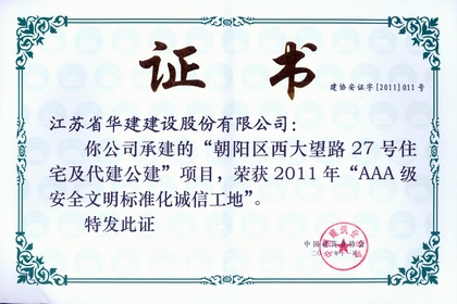 該工程先后榮獲2010年度“北京市文明安全樣板工地”和2011年度全國“AAA級安全文明標(biāo)準(zhǔn)化誠信工地”榮譽(yù)稱號。
