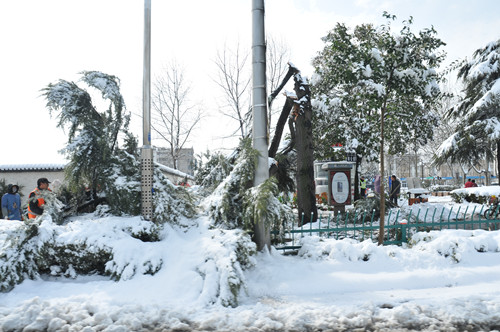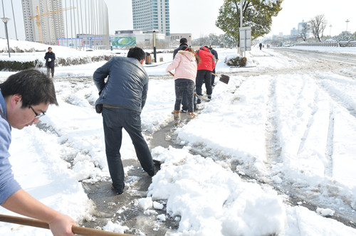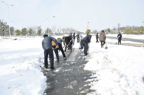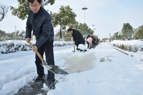 公司總部組織員工上路清掃積雪 時間:2013-02-19 4198 2月18日至19日凌晨,揚州出現(xiàn)低溫降雪災害天氣,降下了多年罕見的一場大雪,壓垮樹枝和部分房屋設施,并造成道路交通不便。19日清晨,公司響應市政府號召,組織20余名員工上路清掃積雪,公司領導吳士茂、錢啟明親自參加,與大家共同會戰(zhàn)2個多小時,完成了清掃任務。 厚重的積雪壓垮樹枝