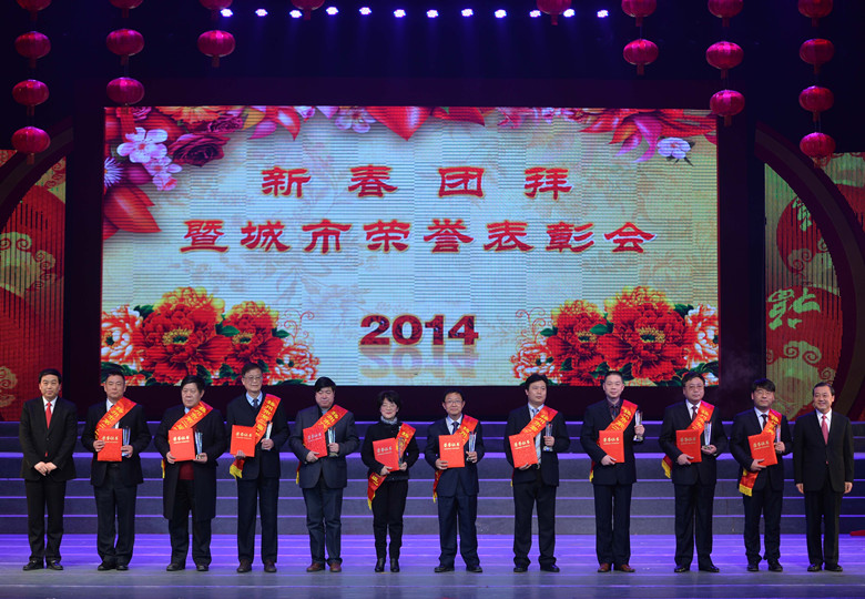 112日晚揚州市委、市政府召開的2014新春團拜暨城市榮譽表彰會上,公司副董事長、總經理宗有農當選為“揚州市十大功臣”,揚州市委書記謝正義親自為宗有農總經理頒獎。