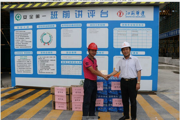 區域公司領導赴三亞工地進行高溫慰問 時間:2015-06-20 3218 6月19日上午,海南分公司黨總支副書記沈巨青帶隊,在分公司工會代表等相關部門陪同下,走訪慰問了三亞婦幼保健院項目部,看望了堅守崗位奮戰在高溫一線的項目部人員,并給他們送去了礦泉水、洗漱用品和防暑藥品。 慰問組一行實地了解項目部的進展情況以及現場人員的食、住、行、業務學習安排等情況,叮囑大家在高溫季節要切實加強現場管理,繃緊安全弦,確保平穩有序生產。