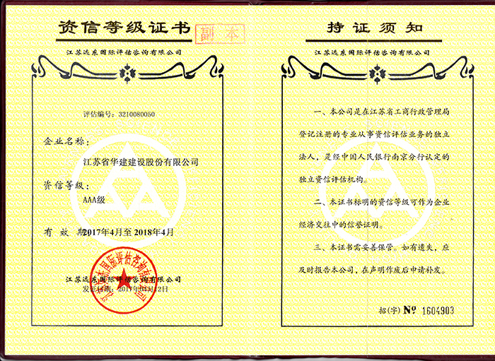 經(jīng)江蘇遠(yuǎn)東國(guó)際評(píng)估咨詢有限公司專家委員會(huì)審定,江蘇省華建建設(shè)股份有限公司資信等級(jí)為AAA級(jí)。